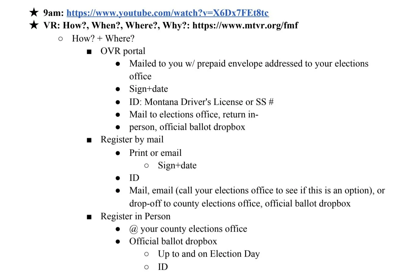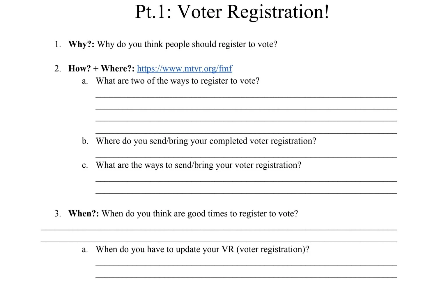 As part of Forward Montana Foundation’s high school fellowship, all 10 fellows were given Underage Democracy workshop templates to facilitate. You can see some of Forward Montana Foundation’s workshops in action in the photos above, including the Montana State Budget workshop and the Judicial System workshop. For my final project for the fellowship, I decided to create my own workshop: the Future Voter workshop, based off of Forward Montana Foundation’s templates. My goal for the workshop was for all Cottonwood Branches to know how, when, where, and why to register to vote and VOTE!